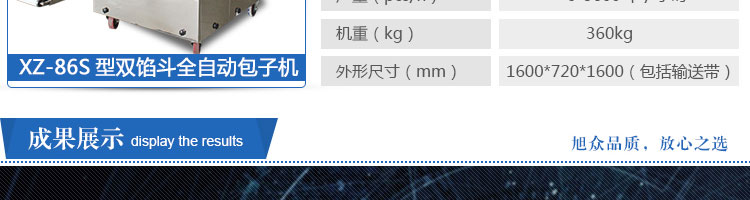 XZ-86S型雙餡斗全自動(dòng)包子機(jī),可生產(chǎn)各種肉包、肉菜包、菜包、小籠包、湯包、水晶包、圓饅頭、奶黃包、豆沙包、叉燒包、南瓜餅等幾十種包餡制品。適用于賓館、飯店、學(xué)校、機(jī)關(guān)企業(yè)食堂、饅頭或包子加工廠、早餐工程店及速凍食品廠等單位。可滿足不同客戶群體。免費(fèi)提供工藝技術(shù)。免費(fèi)上門(mén)培訓(xùn)指導(dǎo)安裝。