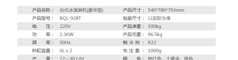 BQL-928T臺式冰淇淋機,1.選用國際牌壓縮機,輔以旭眾精湛工藝,大大縮短冰淇淋成型時間,高效節(jié)能;2.全新液晶智能觸控面板,簡單明了,多功能易操作;3.全新升級專業(yè)膨化泵,膨化率高,產(chǎn)量增加30%;4.一鍵清洗功能,省時方便;5.主要部件采用不銹鋼材質(zhì),時尚美觀,持久耐用;6.先進的機械攪拌系統(tǒng),機器運行穩(wěn)定可靠,低噪音,產(chǎn)品口感爽滑細(xì)嫩。