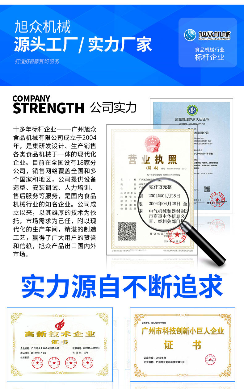 廣州旭眾食品機(jī)械有限公司是一家集科研開發(fā),生產(chǎn)設(shè)計,營銷服務(wù)為一體的現(xiàn)代化生產(chǎn)企業(yè)。現(xiàn)代化生產(chǎn)車間,精湛制造技術(shù),所產(chǎn)機(jī)械歷經(jīng)市場重重考驗,不斷贏得海內(nèi)外客戶的贊譽(yù)。
