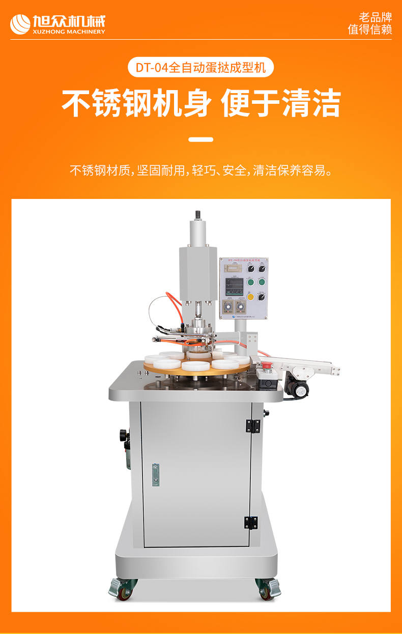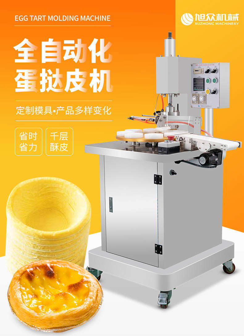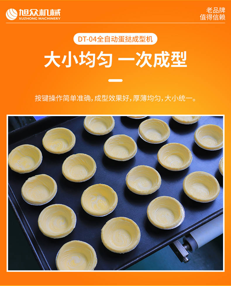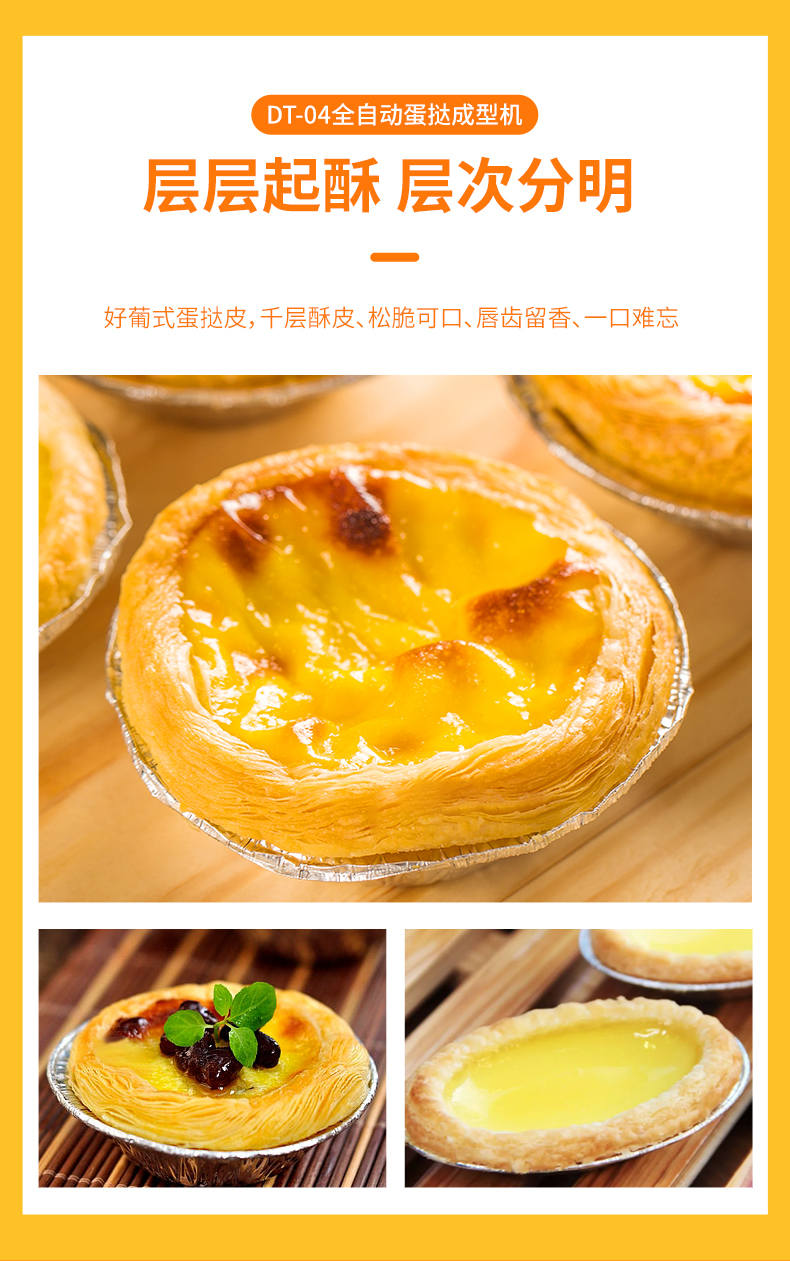 DT-04全自動(dòng)蛋撻成型機(jī),2-3秒快速成型。該機(jī)應(yīng)用于傳統(tǒng)蛋撻、葡式蛋撻及其它須印型之產(chǎn)品突破傳統(tǒng)用手捏,采用微電子控制成型,一個(gè)2-3秒,高效率。大小均勻一次成型按鍵操作簡(jiǎn)單準(zhǔn)確,成型效果好,厚薄均勻,大小統(tǒng)-。層層起酥層次分明好葡式蛋撻皮,千層酥皮、松脆可口、唇齒留香、一口難忘。