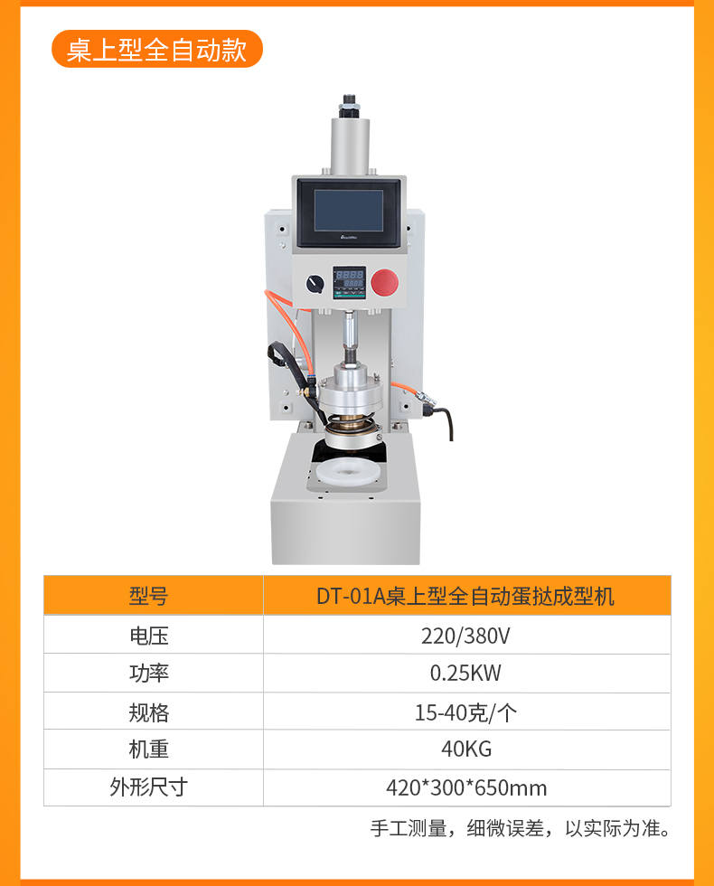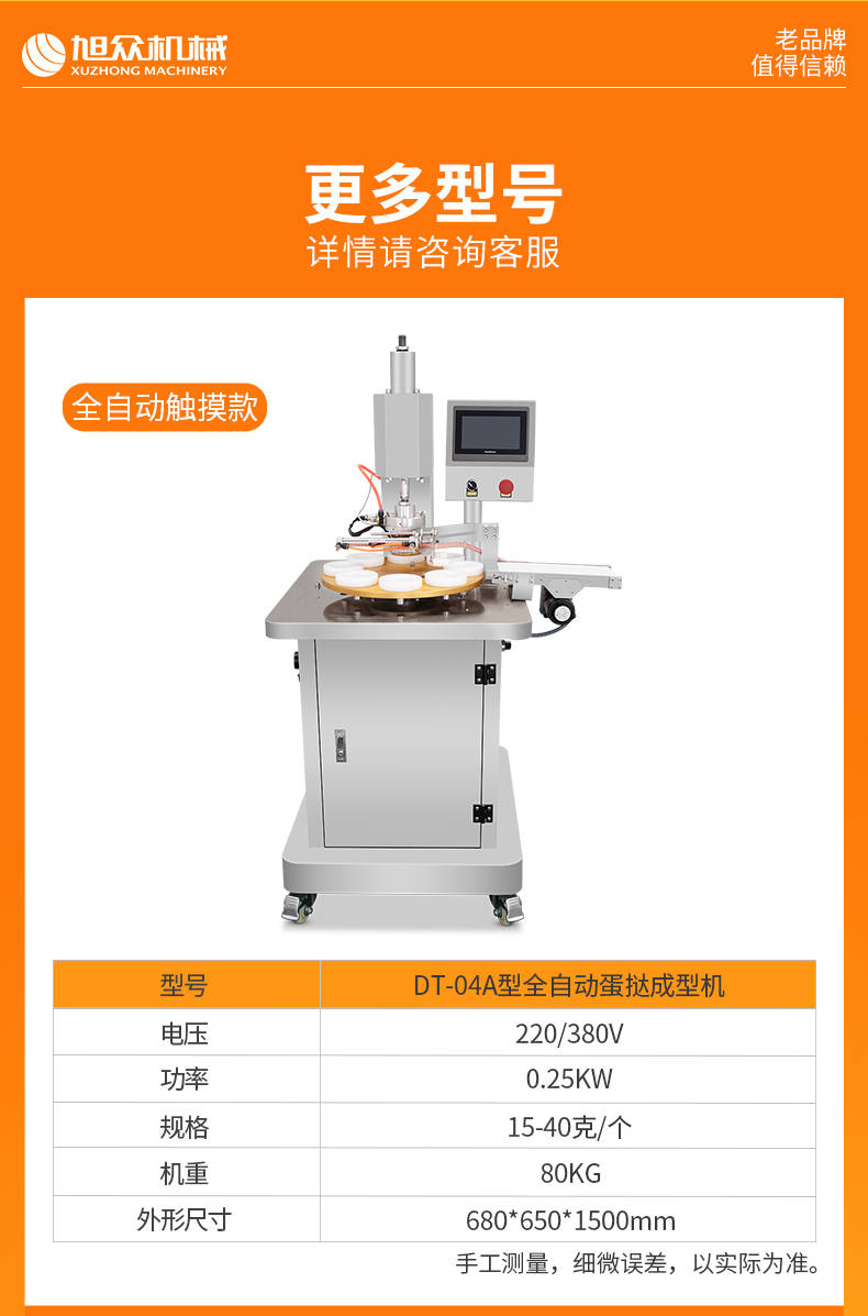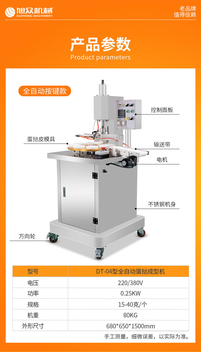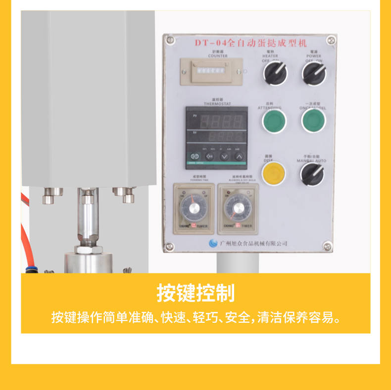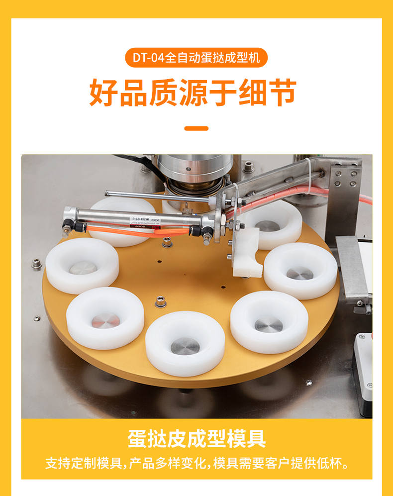 DT-04全自動(dòng)蛋撻成型機(jī),2-3秒快速成型。該機(jī)應(yīng)用于傳統(tǒng)蛋撻、葡式蛋撻及其它須印型之產(chǎn)品突破傳統(tǒng)用手捏,采用微電子控制成型,一個(gè)2-3秒,高效率。大小均勻一次成型按鍵操作簡(jiǎn)單準(zhǔn)確,成型效果好,厚薄均勻,大小統(tǒng)-。層層起酥層次分明好葡式蛋撻皮,千層酥皮、松脆可口、唇齒留香、一口難忘。