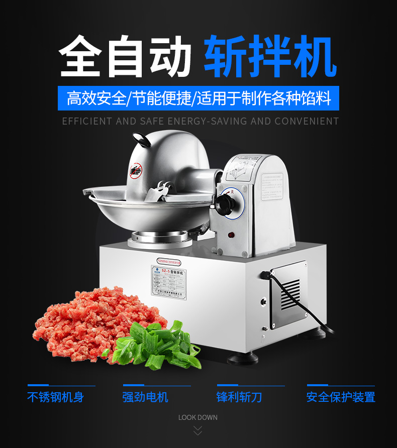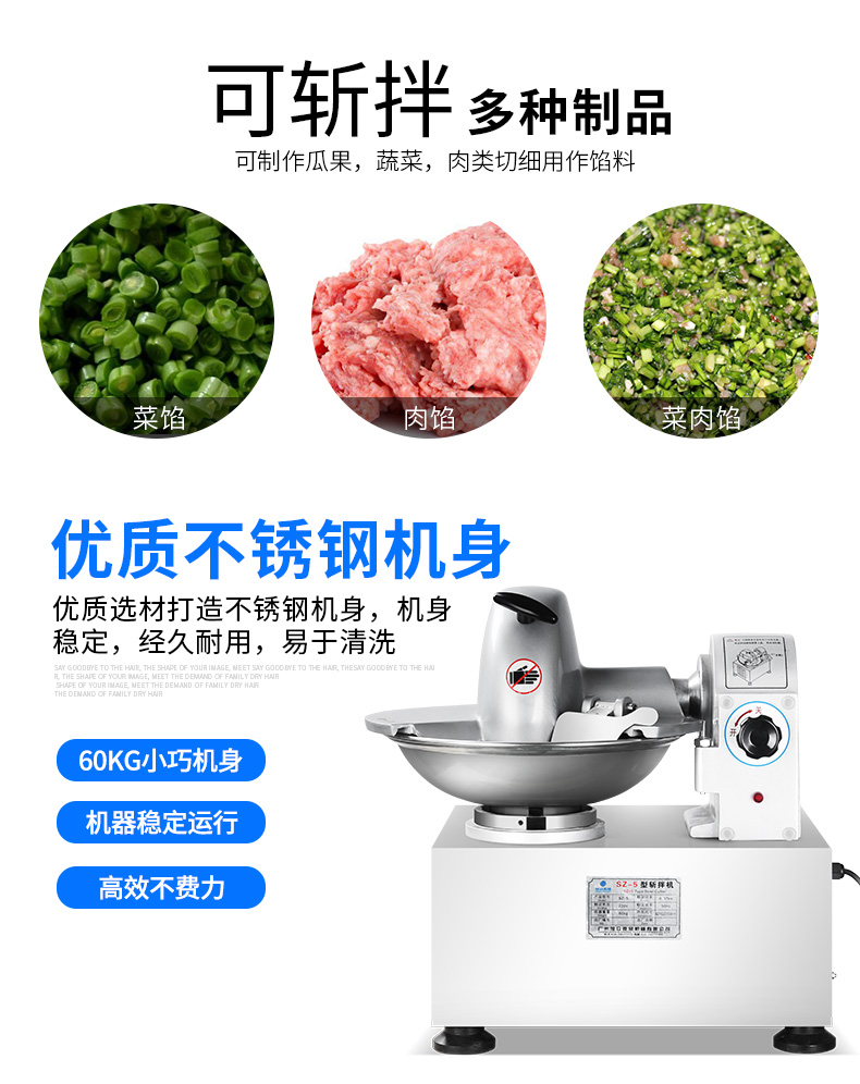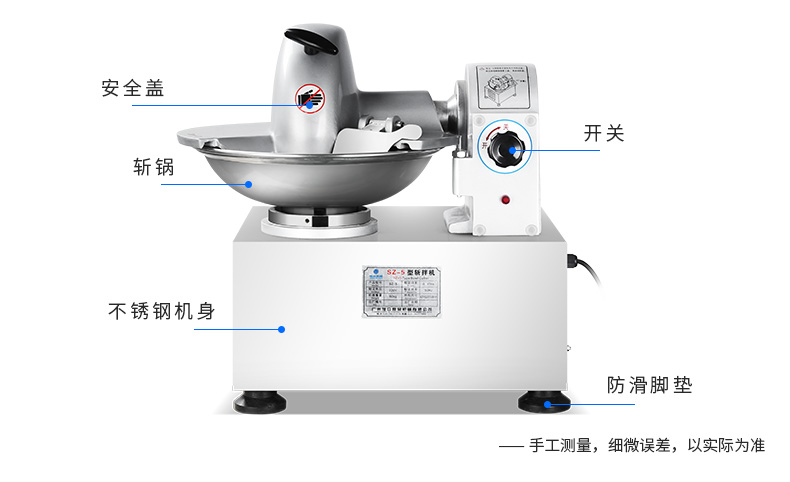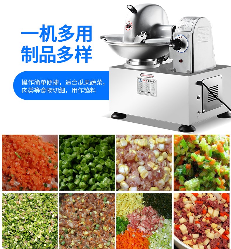 SZ-5型斬拌機,全自動斬拌機,高效安全、節(jié)能便捷、適用于制作各種餡料??蓴匕瓒喾N制品,可制作瓜果,蔬菜,肉類切細用作餡料。優(yōu)質選材打造不銹鋼機身,機身穩(wěn)定,經(jīng)久耐用,易于清洗。