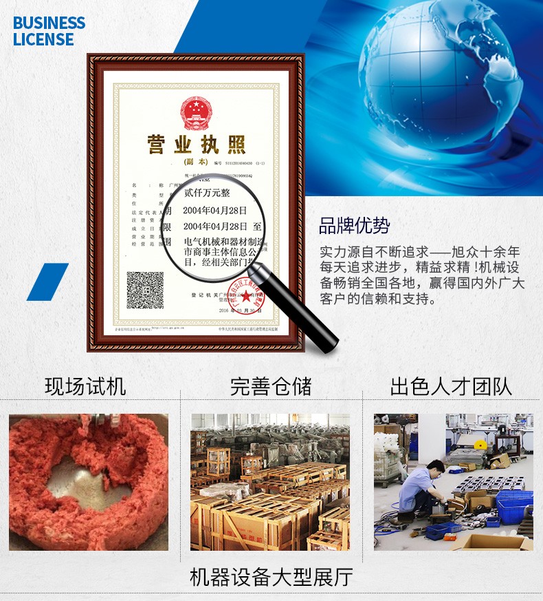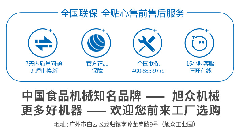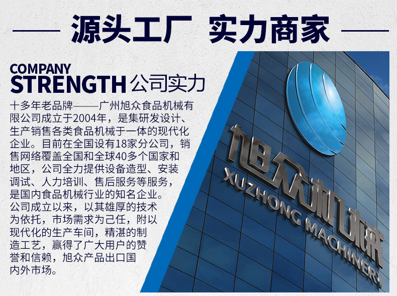 廣州旭眾食品機械有限公司是一家集科研開發(fā),生產(chǎn)設計,營銷服務為一體的現(xiàn)代化生產(chǎn)企業(yè)?,F(xiàn)代化生產(chǎn)車間,精湛制造技術,所產(chǎn)機械歷經(jīng)市場重重考驗,不斷贏得海內外客戶的贊譽。