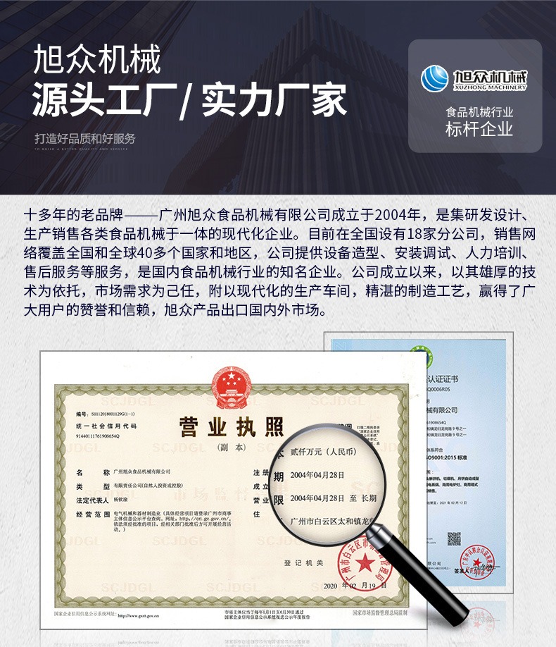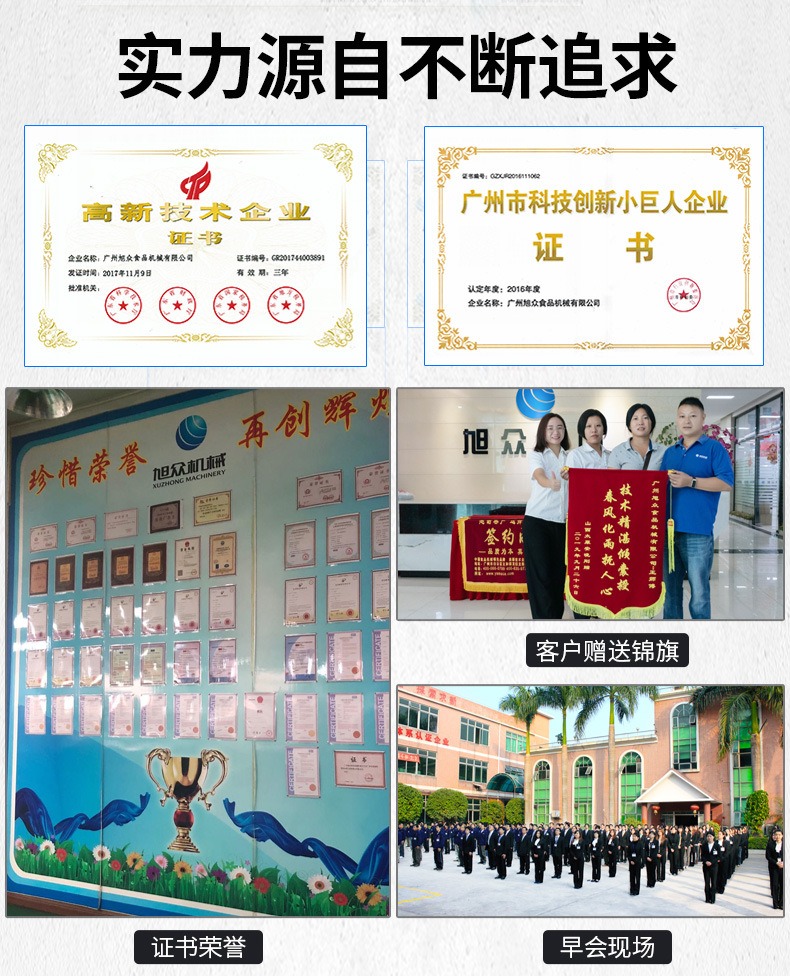 廣州旭眾食品機械有限公司是一家集科研開發(fā),生產(chǎn)設(shè)計,營銷服務(wù)為一體的現(xiàn)代化生產(chǎn)企業(yè)。現(xiàn)代化生產(chǎn)車間,精湛制造技術(shù),所產(chǎn)機械歷經(jīng)市場重重考驗,不斷贏得海內(nèi)外客戶的贊譽。