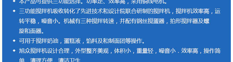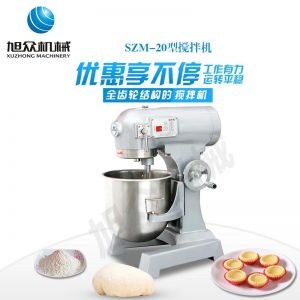SZM-20型四功能攪拌機(jī),可用于攪拌奶油、蛋糕液、餡料及和制面團(tuán)等操作。打蛋攪拌機(jī)等作攪拌食料、揉和面團(tuán)之用,是生產(chǎn)優(yōu)質(zhì)糕點(diǎn)的理想設(shè)備,適用于酒店、飯店、學(xué)校部門(mén)、面包屋以及食品廠家。