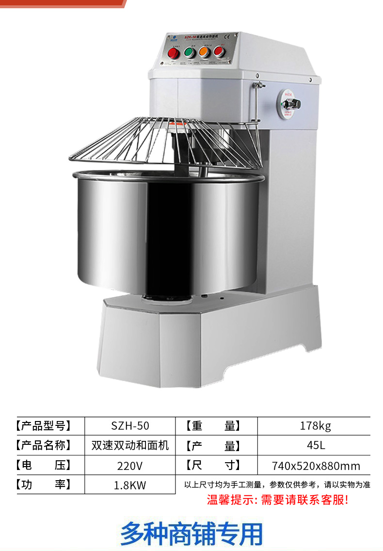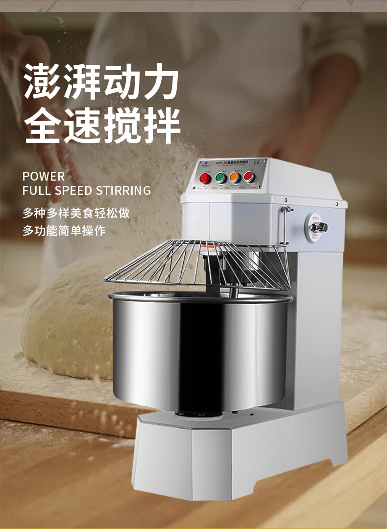 SZH-50型雙速雙動(dòng)和面機(jī),本機(jī)適合攪拌各種面包、包子、饅頭、湯圓、披薩餅面團(tuán),專業(yè)設(shè)計(jì)避免面團(tuán)過(guò)分升溫并確保面團(tuán)含氧量。過(guò)載、缺相保護(hù)裝置,防護(hù)罩安全連動(dòng)裝置。