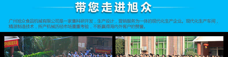 廣州旭眾食品機械有限公司是一家集科研開發(fā),生產(chǎn)設計,營銷服務為一體的現(xiàn)代化生產(chǎn)企業(yè)?,F(xiàn)代化生產(chǎn)車間,精湛制造技術(shù),所產(chǎn)機械歷經(jīng)市場重重考驗,不斷贏得海內(nèi)外客戶的贊譽。