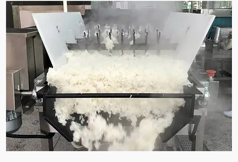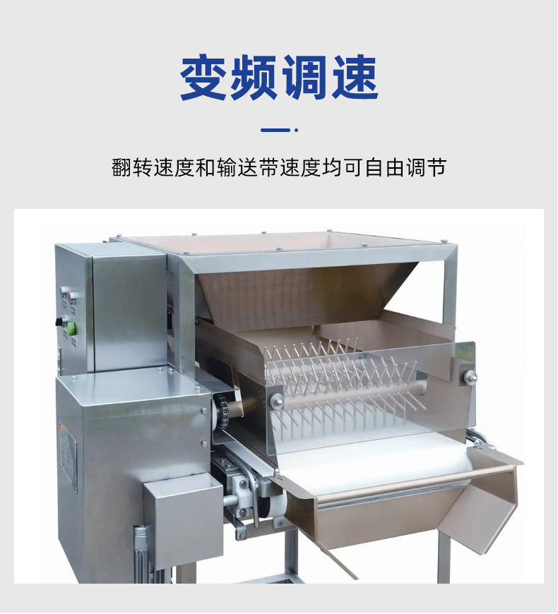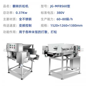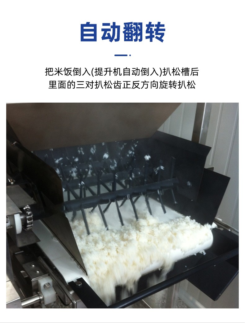 智能米飯扒松機-翻轉扒松機,主要結構:由不銹鋼機架、翻鍋機構、扒松機構輸送機構和電氣自動系統(tǒng)等組成。適用對象:主要用于中央廚房、團膳、企事業(yè)單位食堂等