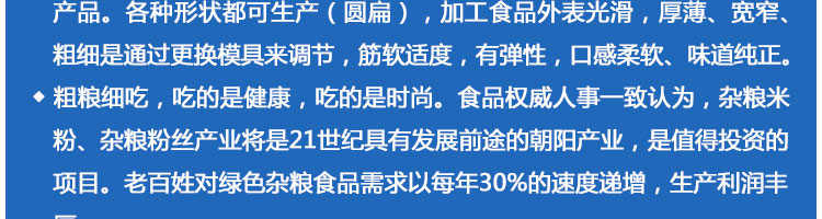 SZ-350多功能米粉機,生產(chǎn)多樣性可生產(chǎn)米粉、米線、粉絲、粉條、、年糕、玉米面條、各種雜糧粉絲、各種面條、雜糧面條、彩色面條以及以紅薯、玉米、大豆、蠶豆等制成淀粉為原料的等多種食品而且每種食品厚薄、粗細等規(guī)格可根據(jù)需要任意調(diào)整。
