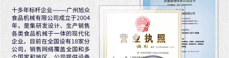 廣州旭眾食品機(jī)械有限公司是一家集科研開發(fā),生產(chǎn)設(shè)計(jì),營銷服務(wù)為一體的現(xiàn)代化生產(chǎn)企業(yè)?,F(xiàn)代化生產(chǎn)車間,精湛制造技術(shù),所產(chǎn)機(jī)械歷經(jīng)市場重重考驗(yàn),不斷贏得海內(nèi)外客戶的贊譽(yù)。