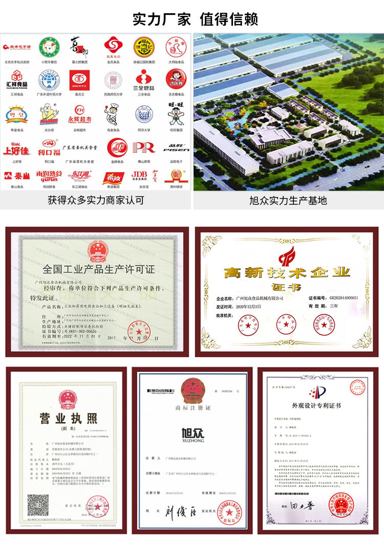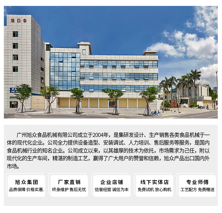 廣州旭眾食品機(jī)械有限公司是一家集科研開(kāi)發(fā),生產(chǎn)設(shè)計(jì),營(yíng)銷服務(wù)為一體的現(xiàn)代化生產(chǎn)企業(yè)?,F(xiàn)代化生產(chǎn)車間,精湛制造技術(shù),所產(chǎn)機(jī)械歷經(jīng)市場(chǎng)重重考驗(yàn),不斷贏得海內(nèi)外客戶的贊譽(yù)。