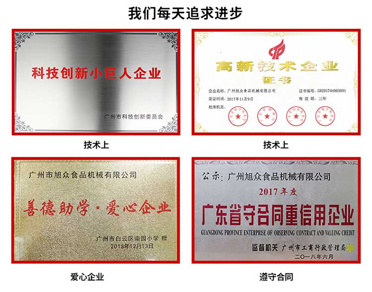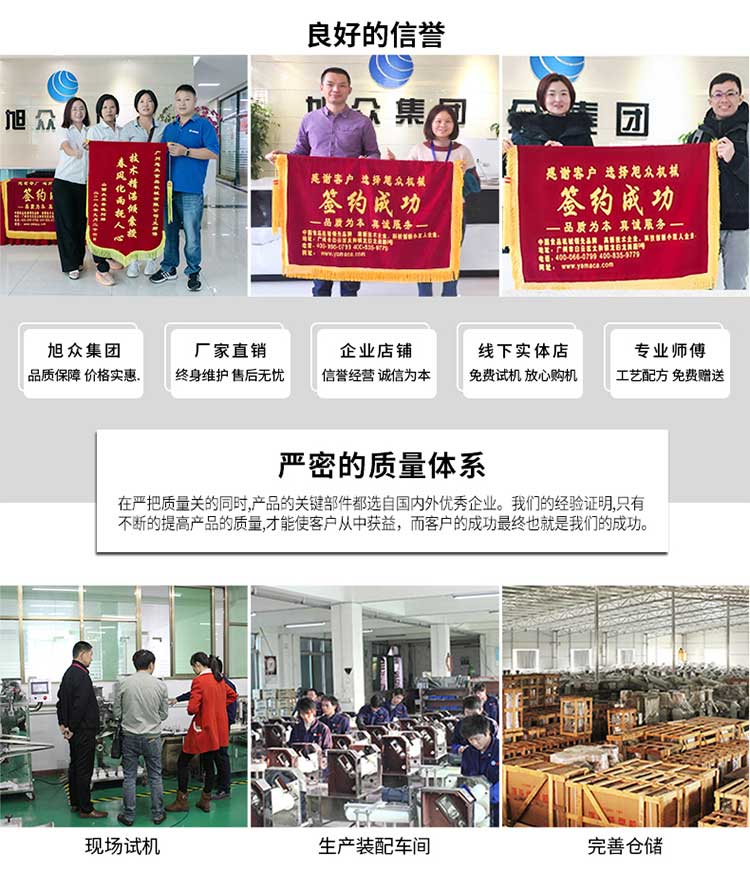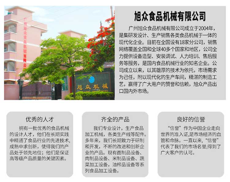 廣州旭眾食品機械有限公司是一家集科研開發(fā),生產(chǎn)設計,營銷服務為一體的現(xiàn)代化生產(chǎn)企業(yè)?,F(xiàn)代化生產(chǎn)車間,精湛制造技術,所產(chǎn)機械歷經(jīng)市場重重考驗,不斷贏得海內(nèi)外客戶的贊譽。