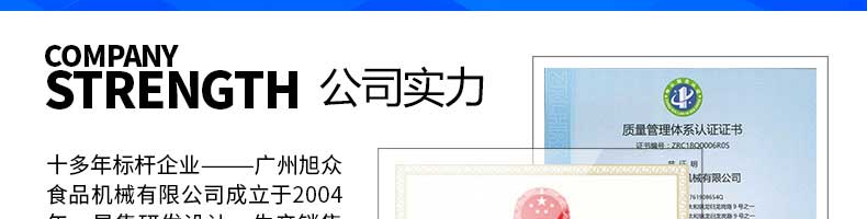 廣州旭眾食品機(jī)械有限公司是一家集科研開發(fā),生產(chǎn)設(shè)計,營銷服務(wù)為一體的現(xiàn)代化生產(chǎn)企業(yè)。現(xiàn)代化生產(chǎn)車間,精湛制造技術(shù),所產(chǎn)機(jī)械歷經(jīng)市場重重考驗(yàn),不斷贏得海內(nèi)外客戶的贊譽(yù)。