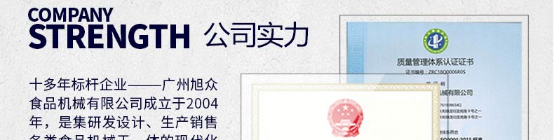 廣州旭眾食品機(jī)械有限公司是一家集科研開發(fā),生產(chǎn)設(shè)計(jì),營銷服務(wù)為一體的現(xiàn)代化生產(chǎn)企業(yè)?,F(xiàn)代化生產(chǎn)車間,精湛制造技術(shù),所產(chǎn)機(jī)械歷經(jīng)市場(chǎng)重重考驗(yàn),不斷贏得海內(nèi)外客戶的贊譽(yù)。